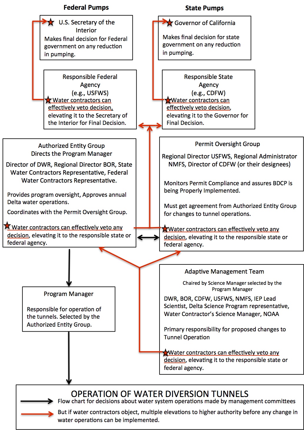 No – because no matter what harm the tunnels might cause, it will be virtually impossible to curtail water exports once the tunnels start operation. Because the main backers of the tunnels, the water contractors who will receive water deliveries from the tunnel and sell the water to their urban and agricultural customers, have seats on key committees and can veto decisions they don’t like escalating the decision all the way to either the Governor of California (for the State pump decisions) or the U.S. Secretary of the Interior who reports directly to the President (for Federal pump decisions).