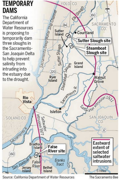 The announcement says the dams purpose is to keep salt water from coming into the estuary during the drought. However, the alternative is to export less water. There is sufficient fresh water for urban use and most farming. The expanding profitable almond orchards need to be balanced with the available water resources.