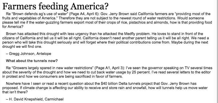 Editorial cartoon and letters to the editor in today’s Sacramento Bee.