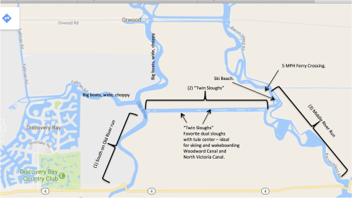 We often go up and down Twin Sloughs until our gang gets tired. If Twin Sloughs is too crowded, there’s the option to ski Middle River. North on Middle River is just a short run past Ski Beach and you need to turn around before the 5 MPH zone at the ferry crossing. South on Middle River towards Union Point Bar & Grill is descent until you need to turn around because of the 5 MPH zone and Hwy 4 bridge.