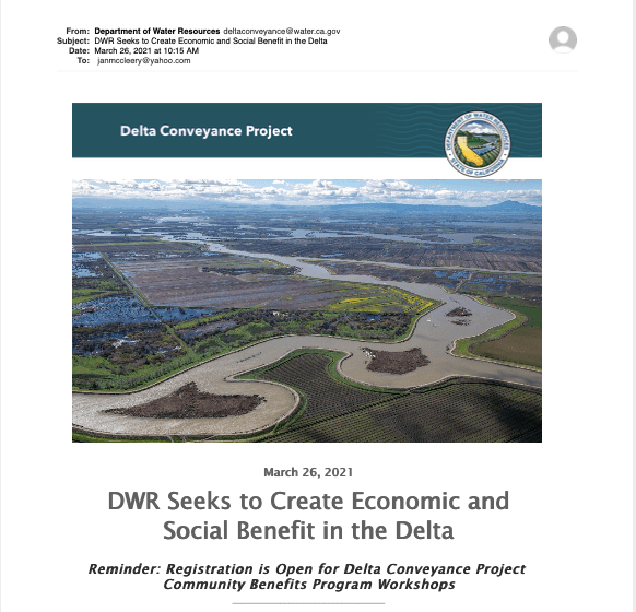 It looks like DWR is going to send out emails about their phony “Community Benefits Program Workshops” regularly.