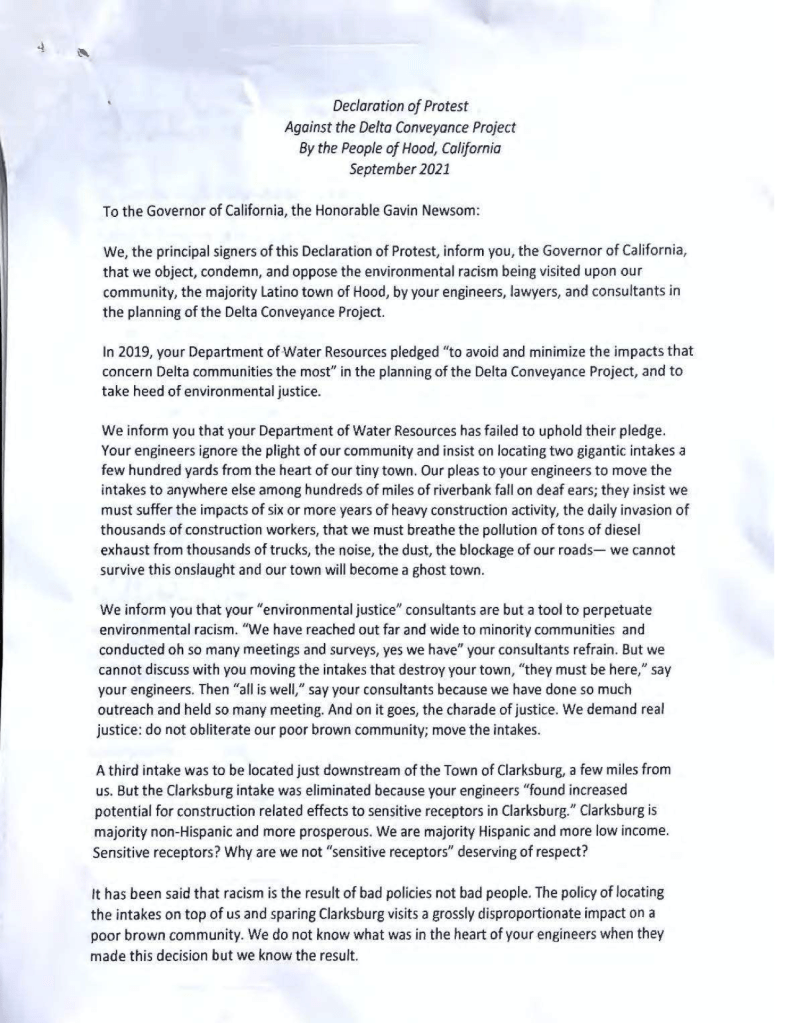 Since the start of the tunnel project (Bay Delta Conservation Plan, then WaterFix, now the single tunnel Delta Conveyance Project), a repeated concern by everyone, and a big part of STCDA’s push back, has been the location of the intakes for the new pumps. The intakes continue to be planned to be put right on top of the tiny town of Hood.