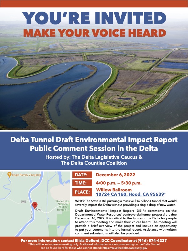 Since the DWR refuses to host real in-person meetings about the Single Tunnel (aka the Delta Conveyance Project) Draft EIR, the Delta County Coalition is taking it on and holding a meeting at ground zero, Hood, CA, the historical legacy community that will be destroyed by the Single Tunnel project. You are invited. Comments made will be recorded and entered into the public record. Having trouble knowing what to submit as comments? They will help write your comments at the meeting. The reporters and press are encouraged to attend.