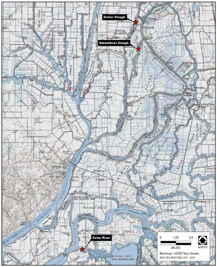 • A prior proposal to put moveable gates on False River, called the Frank’s Tract Project” was dropped, apparently because studies showed it wouldn’t solve the problem. (With some searching, a link to that project can be found on the DWR website.)