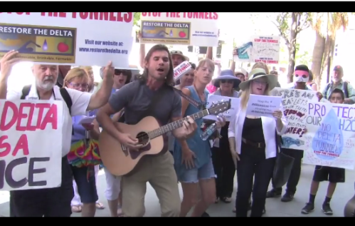 - Feb 20 – Brentwood Scoping Meeting. Good turnout – thanks to all that attended and wore their tee shirts and held up signs 🙂 The room was standing-room only. They should know if they come onto our turf, they need bigger conference rooms! Here’s some photos. I’ll post the video when we have it available. Great comments. Zero percent in the room “for” the tunnels. The young DWR newbies didn’t even know what a Peripheral Canal was. Here’s Gene Beley’s video of the entire meeting.
