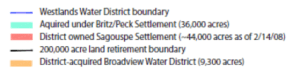[Red] Sagouspe Settlement (2002): Separate from the USBR retirement program, Westlands Water District agreed to buy another 65,000 acres of impaired land, and reallocate the contracted water to equalize water contracts in the district. As of February 14, 2008, the district had acquired over 44,000 acres.